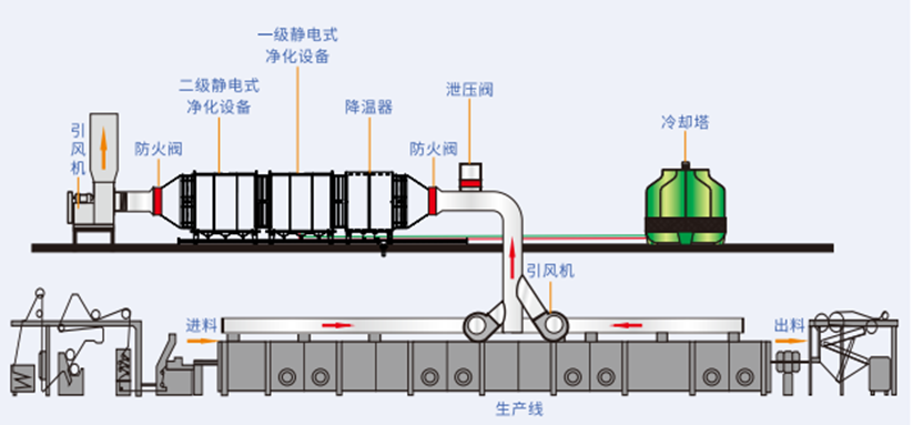 该系统可将皮革生产线排出的高温烟气通过过滤装置将纤维类颗粒物隔除,再经过热交换器将至静电适合处理的温度,后续通过工业静电式烟雾净化设备净化,将DOP、DINP、降粘剂等变成液化油回收。